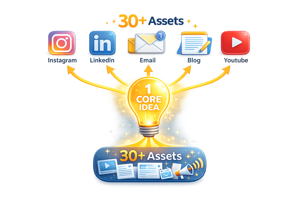 Instead of creating random posts that live and die in 24 hours, you build authority content first—then strategically multiply it across every platform using a proven, repeatable system.